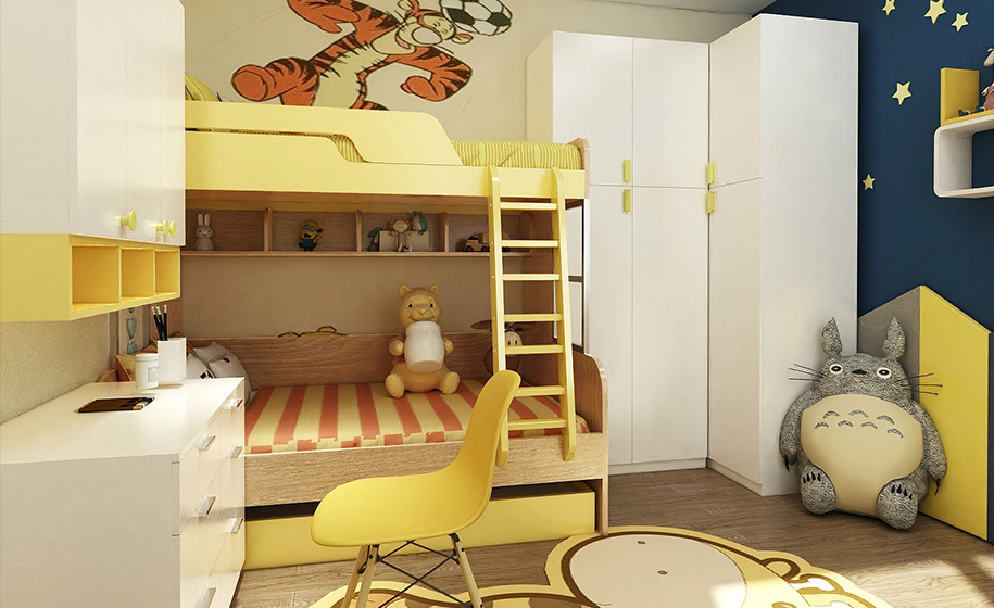 干干凈凈,純粹得一絲不染,兒童床吸取白色的純潔,結(jié)合黃色和質(zhì)感細(xì)膩的原木色搭載出一個(gè)活潑溫馨的臥室空間。卡通風(fēng)格主義與簡約時(shí)尚在此完美融合,搭配各色童趣玩具、抱枕、和卡通墻紙。讓兒童置身在歡樂有趣的環(huán)境中,陪伴孩子快樂成長。