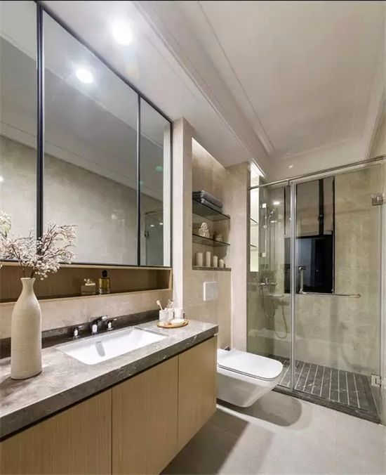 比如大尺寸的浴室鏡可以令視覺深度增加,讓衛(wèi)生間看起來比實(shí)際效果擴(kuò)大一倍以上;用玻璃隔斷代替砌墻和淋浴簾,也能讓衛(wèi)浴空間看上去更通透。